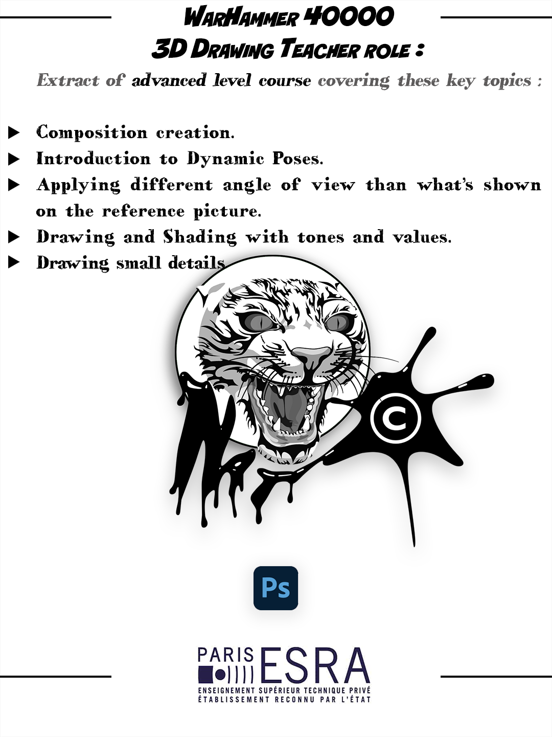 Here is a fan art painting of Warhammer 40,000, which you can see at the bottom of this page. My drawing is not a reproduction; I created it to study values, layout, perspective, dynamics, and camera view. The focus was to make the composition more dynamic while drawing the same character along with all his details and accessories from a different angle, using only values.