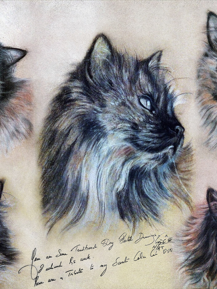 Here are some traditional cat portraits I painted using soft pastels. My focus was primarily on painting fur and accurately interpreting colors—after all, a black cat isn’t just black! There are many other colors in its fur, such as greens, blues, and browns, which, when combined with values, create a more realistic rendering of the fur. The first drawing was made using sanguine pencil and charcoal while observing my cat, serving as an excellent exercise for capturing feline expressions.