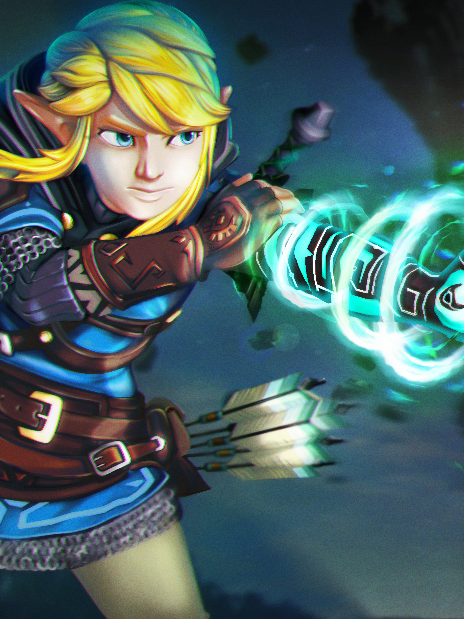 The objective of this illustration was to use the Link statue as a reference to create a completely new composition, following these steps: line art, shading, lighting, coloring, rendering, and special effects (FX). I have also cropped some close-up sections, so feel free to zoom in for more detail.